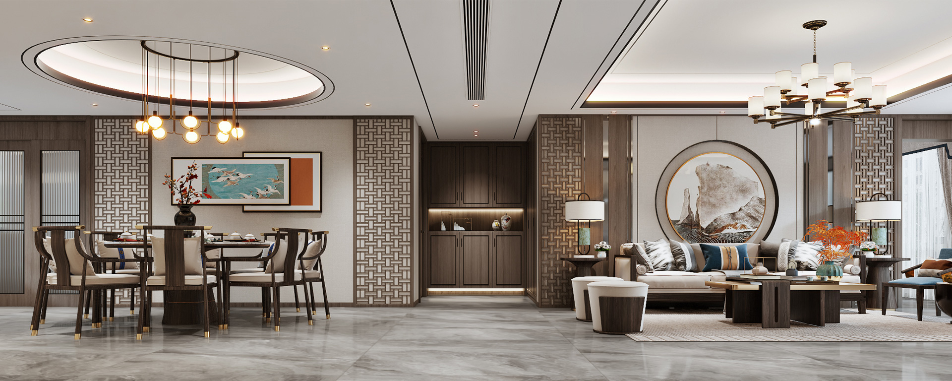 新中式風(fēng)格是中式元素與現(xiàn)代材質(zhì)的巧妙兼柔的布局風(fēng)格,它同時(shí)明清家具、窗欞、布藝床品相互輝映,經(jīng)典地再現(xiàn)了移步變景的精妙小品。